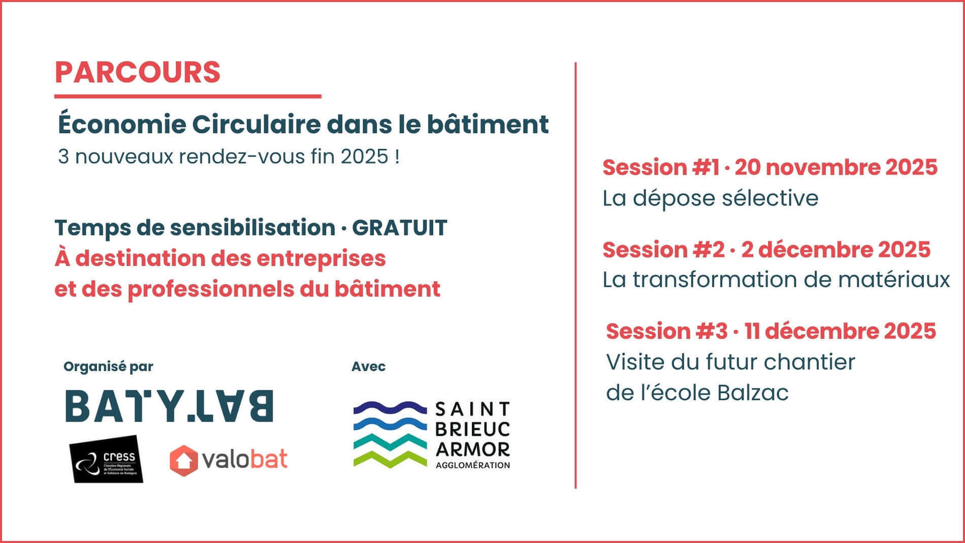 fin 2025 trois temps de sensibilisation à l’économie circulaire dans le bâtiment, à destination des entreprises et professionnels du bâtiment.